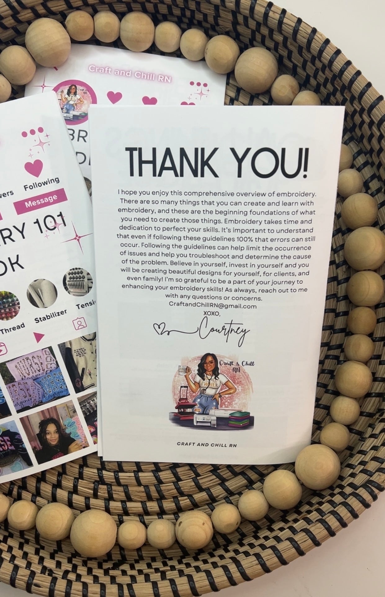 This physical copy of the Embroidery 101 Handbook spans 11 pages, filled with clear tutorials, informative pictures, and easy-to-follow step-by-step guides. It’s designed to help you get started with machine embroidery, from selecting the right supplies to creating your own designs. Along with the physical copy, you’ll also receive access to a downloadable PDF version, so you can have the handbook on hand whenever and wherever you need it. Perfect for both hands-on learners and those who prefer a digital reference!